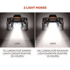 - High mode (216 lumens for 5 hours) is for maximum light and low mode (75 lumens for 12 hours) is for dimmer light