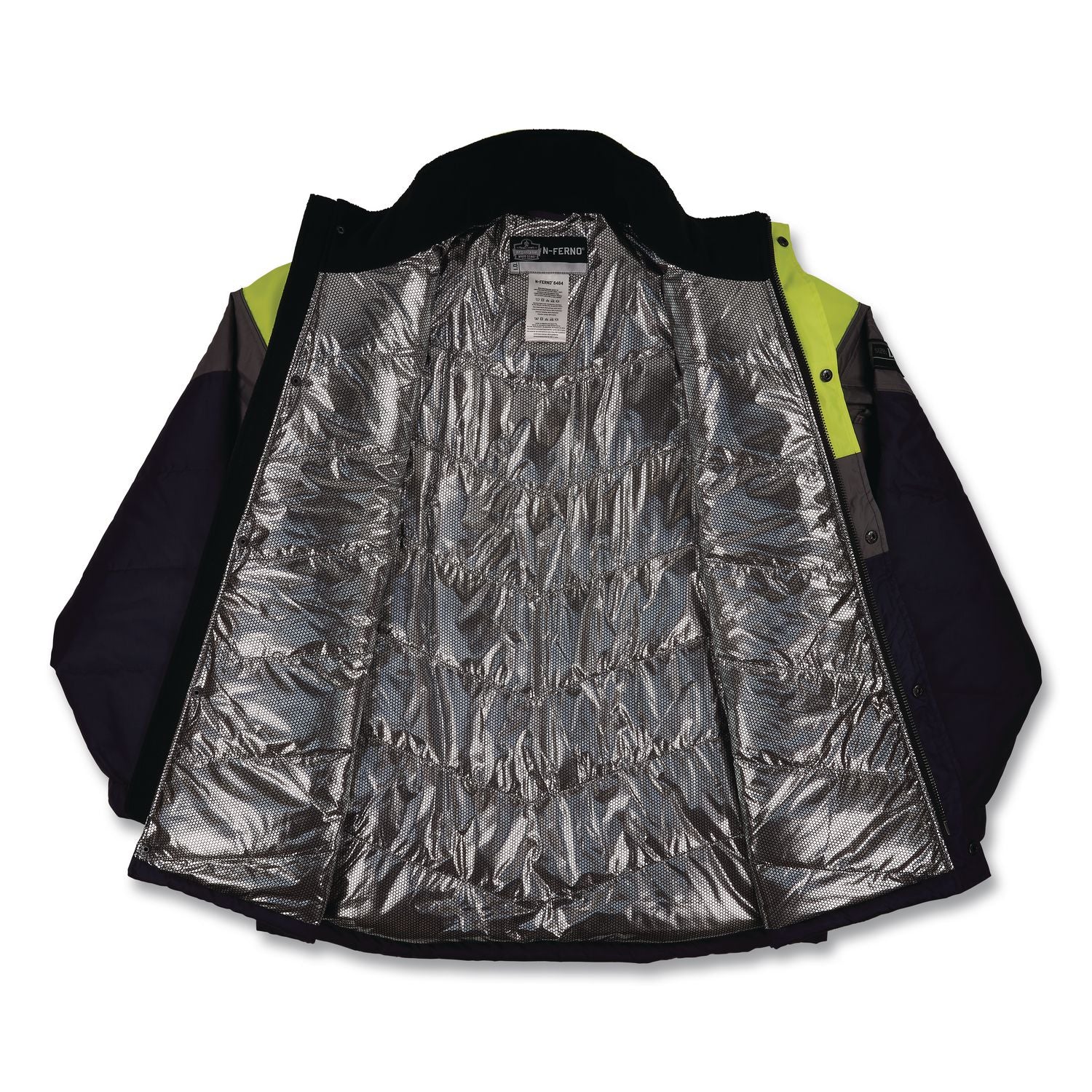 The N-Ferno 6464 Insulated Freezer Jacket with AmpiFIRE™ Heat Reflective Lining is rated to -60° F/-51° C conditions for up to five hours of moderate work activity in freezer cold storage facilities. AmpliFIRE™ aluminum insulation captures, reflects and traps body heat, and the 100% ripstop polyester exterior ensures the jacket delivers warmth, comfort and durability. For additional functionality, the jacket includes oversized front pockets and a pen/stylus holder for ample storage and easy access, even when wearing gloves. Rib-knit cuffs and drawstring cord at the bottom of the jacket help seal out the cold and wind, while heavy-duty zippers with storm flaps offer extra protection against harsh weather. Added lime background material enhances visibility in low-light conditions. A clearly visible exterior size label allows wearers to instantly recognize and select their ideal jacket size. This jacket features a built-in mic tab and d-rings to provide easy access to radios, scanners, ID badges and keys. Designed for practicality, the jacket is machine washable for effortless cleaning and care. Designed with 250 g of 3M™ Thinsulate™ insulation, this jacket traps heat for warmth in extreme cold, ranging from -20° F to -60° F (-29° C to -51° C). The 3M Thinsulate is 30% thinner in profile compared to standard poly fill and has a higher loft design, making it condense at a much slower rate and offers more thermal retention than standard poly fill—increasing its life integrity. Minimized washing will extend the overall life of the thermal, insulated garment. Ideal for those working in freezer cold storage facility freezer rooms. Also designed for outdoor workers in any industry, from construction to mining and outdoor recreational activities such as hiking or snowmobiling. Apparel Type: Jacket; Material(s): Nylon; Polyester; Color(s): Navy; Color Family: Blue.