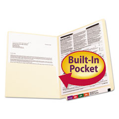 This fastener folder comes with the added feature of a fully-enclosed pocket that can be used to store small objects or papers that cannot be two-hole punched