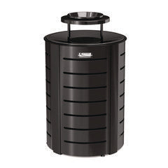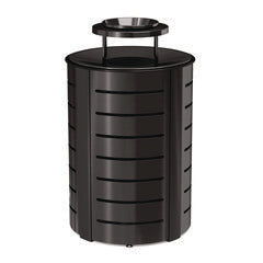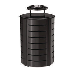 The Suncast Commercial metal trash can features a durable metal lid with ash bonnet to keep cigarettes out of sight
